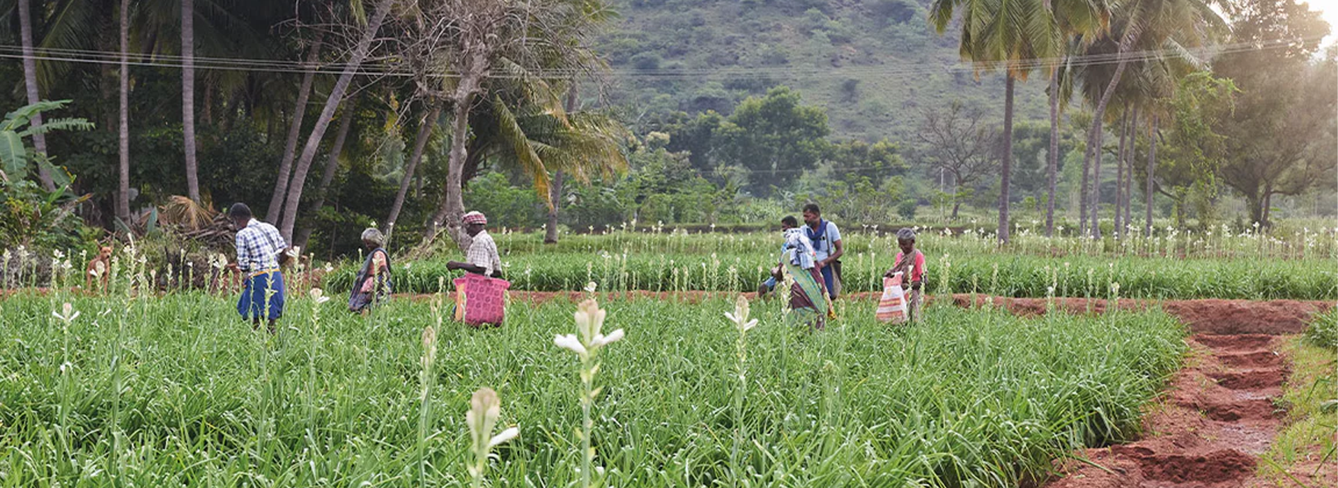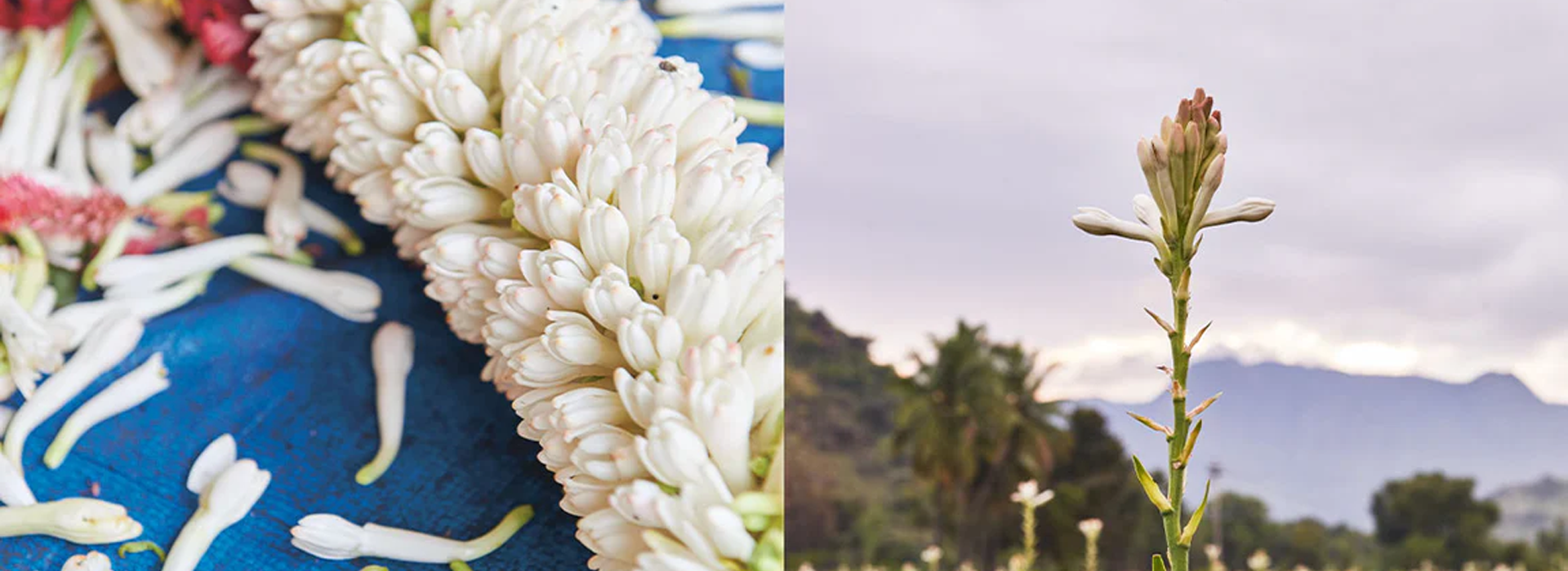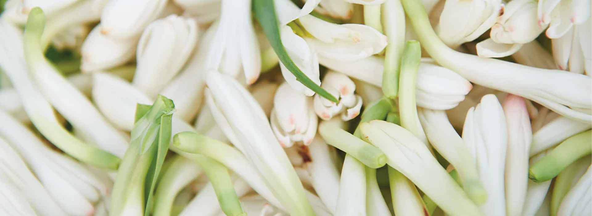 El cultivo de la tuberosa es muy laborioso, un proceso que requiere un mantenimiento constante, mucho escardado y riego. La tuberosa, Polianthes tuberosa L., es una planta perenne de la familia de las agaváceas, una flor tipo lirio que nace de un rizoma. Tiene unas 20 flores blancas como la nieve por cada tallo, que pueden alcanzar un metro de altura. Es una de las plantas más perfumadas del mundo – sus voluptuosas flores tienen la capacidad de emitir un rico aroma 48 horas después de su recolección.